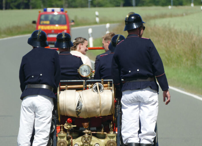 Der Feuerwehrverein Pausa e.V. wartete bereits mit seinem historischen Fahrzeug Opel vor der Kirche. Begleitet von mehreren Einsatzfahrzeugen und einem langen Fahrzeugkorso chauffierten sie das Brautpaar zur Hochzeitsfeier nach Arnsgrün.