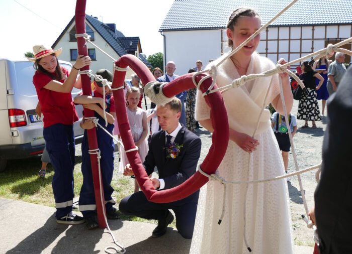 Am Ort der Hochzeitsfeier angekommen, wurden die Frischvermählten von der Jugendfeuerwehr Arnsgrün empfangen. Bevor sie die Location betreten konnten, musste ein rotes Schlauch-Herz aus lauter feuerwehrtypischen Knoten befreit werden!