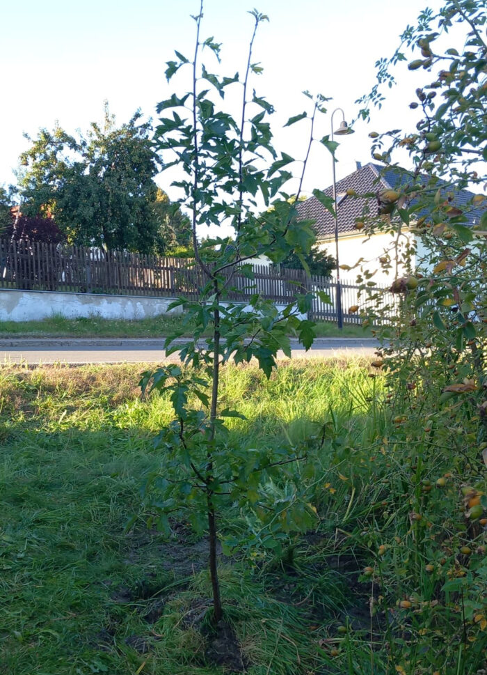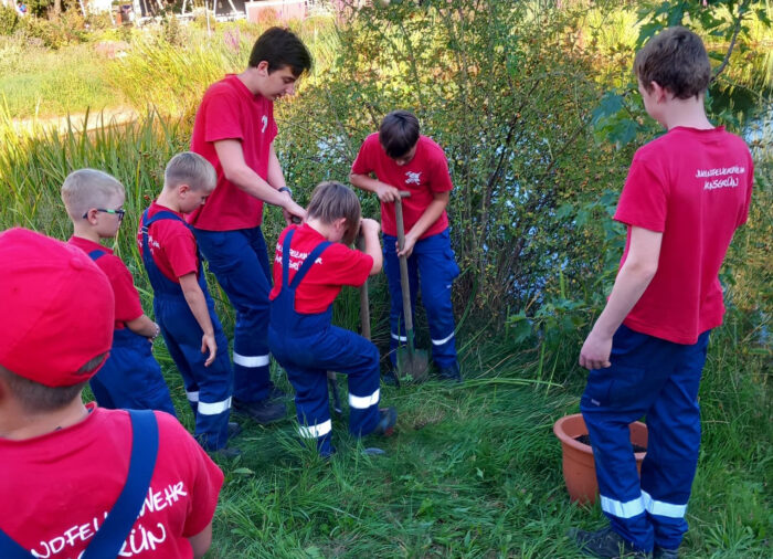Am 16. August, direkt am Tag nach der Nominierung, erfüllten die Arnsgrüner Floriansjünger die Aufgabe im Rahmen ihres Ausbildungsdienstes. So wurde das Thema „Funkausbildung“ etwas eingekürzt und stattdessen etwas für die Natur getan. Eine Familie aus dem Dorf stellte uns freundlicherweise eine junge Elsbeere zur Verfügung, die der Feuerwehr-Nachwuchs auf einem Teichdamm einpflanzte.