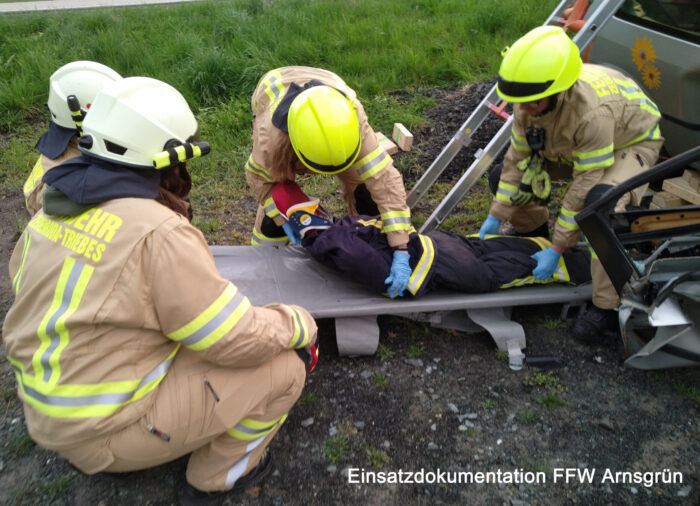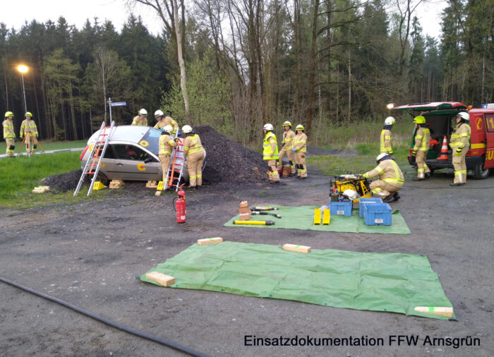 Die Einsatzkräfte mussten im Übungsszenario die beiden bewusstlosen Personen mittels hydraulischem Rettungsspreizer aus dem Fahrzeug befreien. Bevor die Türen des PKWs entfernt werden konnten, musste das Fahrzeug in seiner Schräglage gesichert werden. Aufgabe des Angriffstrupps Arnsgrün war die Betreuung der beiden „Verletzten“. Die weiteren Trupps übernahmen alle Sicherungsmaßnahmen rund um die Einsatzstelle, wozu die Gewährleistung des Brandschutzes, die Verkehrssicherung und die Ausleuchtung bei eintretender Dunkelheit zählten.