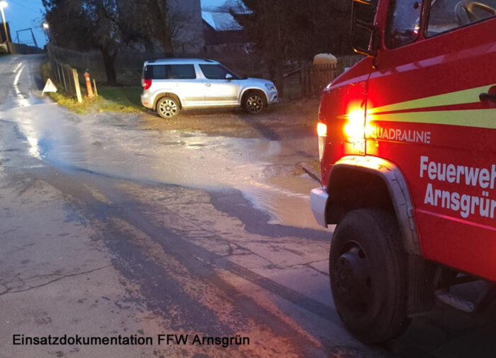 Die Feuerwehr Arnsgrün wurde zu einer verschmutzten Fahrbahn alarmiert. Durch einen Wasserrohrbruch drangen größere Mengen verschmutzten Wassers aus dem Erdreich auf die Straße. Die Einsatzkräfte sicherten und reinigten die Fahrbahn und übergaben die Einsatzstelle an die Wasserwirtschaft.