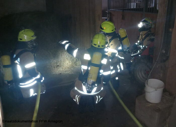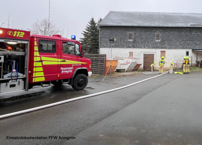 Die Feuerwehr Arnsgrün wurde zur Rauchentwicklung in einem Pferdestall mit einer vermissten Person alarmiert. Es handelte sich dabei um eine Einsatzübung. Vier Einsatzkräfte durchsuchten den Stall unter schwerem Atemschutz und retteten die vermisste Person. Die Wasserversorgung wurde vom Hydrantennetz hergestellt. Die Freiwillige Feuerwehr Arnsgrün bedankt sich bei den Eigentümern für die Bereitstellung des Übungsobjekts.