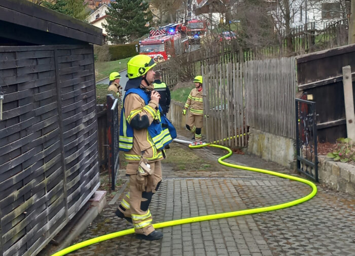 Die Feuerwehren wurden zum Brand einer Garage alarmiert. Vor Ort stellte sich das Szenario als Brand zweier Mülltonnen unter dem Vordach der Garage dar. Dank des schnellen Eingreifens eines Nachbarn mit zwei Feuerlöschern konnte ein Übergreifen auf den Dachstuhl verhindert werden. Die Einsatzkräfte führten Nachlöscharbeiten durch, belüfteten das verrauchte Gebäude und kontrollierten den Dachstuhl mittels Wärmebildkamera.
